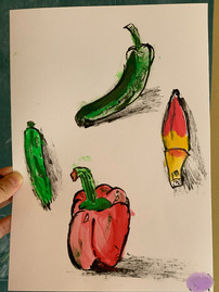 本番の紙に、それぞれ野菜を1つずつ持って行って、形を触ってみたりよく観察しながら、割り箸ペンで輪郭を描いていきます。その後は筆で色塗り。