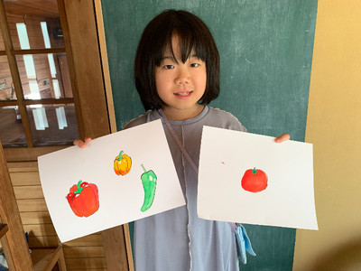 絵を思い切り描くカリキュラムもやりたいと考えていたところ、夏野菜の元気が出る色合いや形を子供達が表現したらどうなるかな?と思い企画した「割り箸ペンで夏野菜!」。
